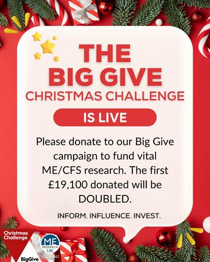 Your support matters – £1 becomes £2, £5 becomes £10, £10 becomes £20, and so on. Until midday next Tuesday, December 9th, donations will be DOUBLED until donations hit £19,100. Every donation, big or small, makes a difference and will go towards funding vital ME/CFS research.