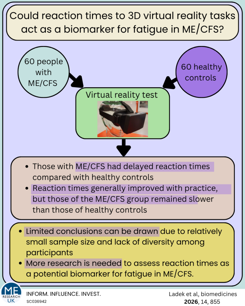 It is also worth highlighting that these findings support the hypothesis of a ME Research UK–funded PhD study by Anosha Altaf, which proposes that reduced nerve responses in ME/CFS are associated with slower, less accurate responses to visual stimuli. You can read more about Anosha’s work here: