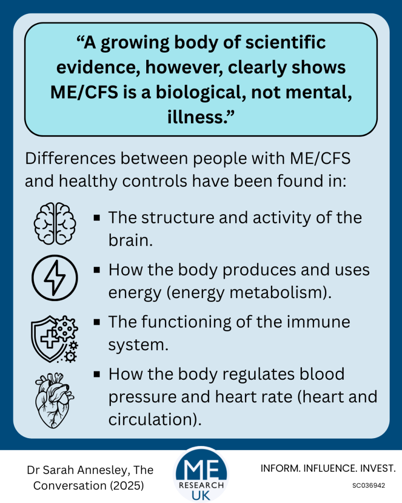 In the piece, Dr Annesley highlights the physical nature of the disease, stating that the World Health Organisation recognises ME/CFS as a neurological disease (a disease of the nervous system).