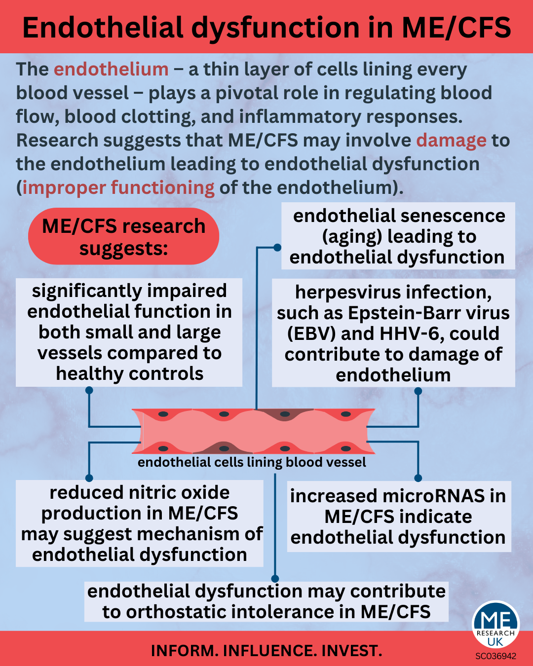 Every blood vessel in your body has a lining called the endothelium. This lining is involved in important processes such as controlling how well your blood flows or clots. When the endothelium becomes faulty, for example through being damaged by a herpesvirus, this is known as endothelial dysfunction. Endothelial dysfunction has been found to occur in ME/CFS as indicated by tests assessing how well blood vessels change in size, and by levels of molecules known as microRNAs (which play a role in the functioning of your genes). Endothelial dysfunction potentially underlies orthostatic intolerance in ME/CFS (symptoms that worsen when upright), and may contribute to symptoms such as cognitive dysfunction. Further robust research still needs to be done.