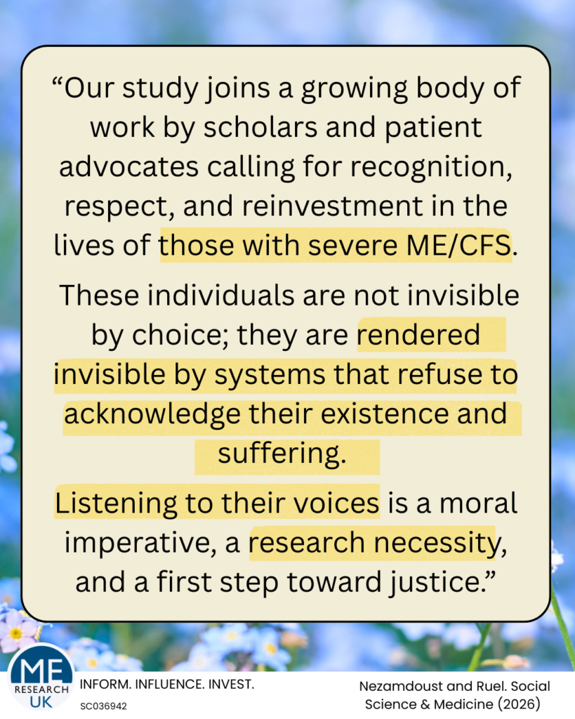 “This study aimed to illuminate the lived experiences of people with severe ME/CFS, as an understudied, hard-to-reach population, by analyzing their narratives on social media. Our findings reveal that the experiences of severe ME/CFS extend beyond the devastating physical symptoms to encompass a broader landscape of emotional, social, and institutional hardship.”