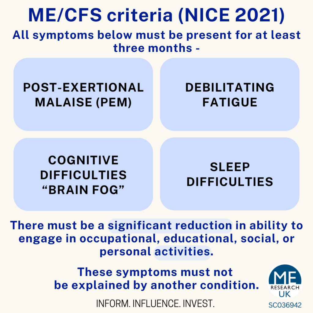 Myalgic encephalomyelitis/chronic fatigue syndrome (ME/CFS) is a debilitating condition that significantly impacts quality of life. ME/CFS is not just fatigue. According to the NICE 2021 guideline, diagnosis also requires: