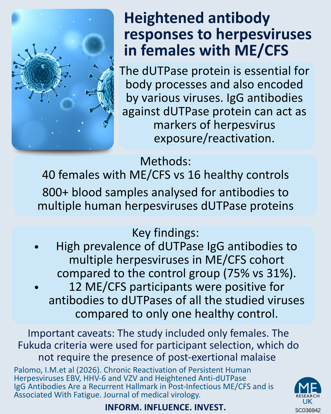 A recent study analysed over 800 blood samples from 40 females with ME/CFS compared to 16 healthy controls. The study primarily examined differences in antibodies to human herpesvirus proteins, and it found that participants with ME/CFS exhibited significantly altered antibody levels (indicating viral reactivation) compared to controls.