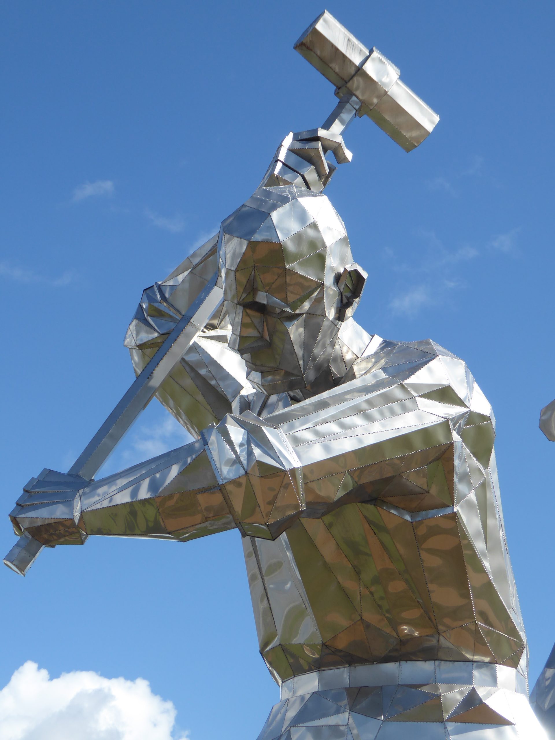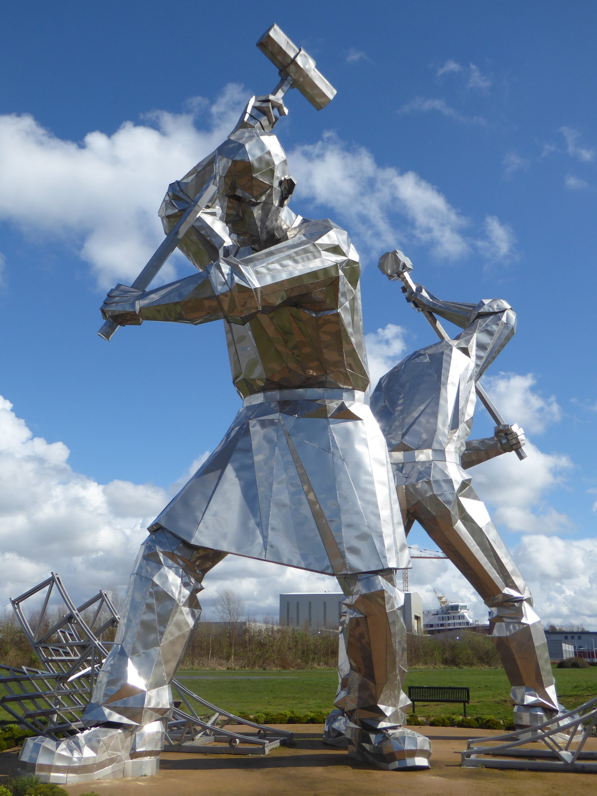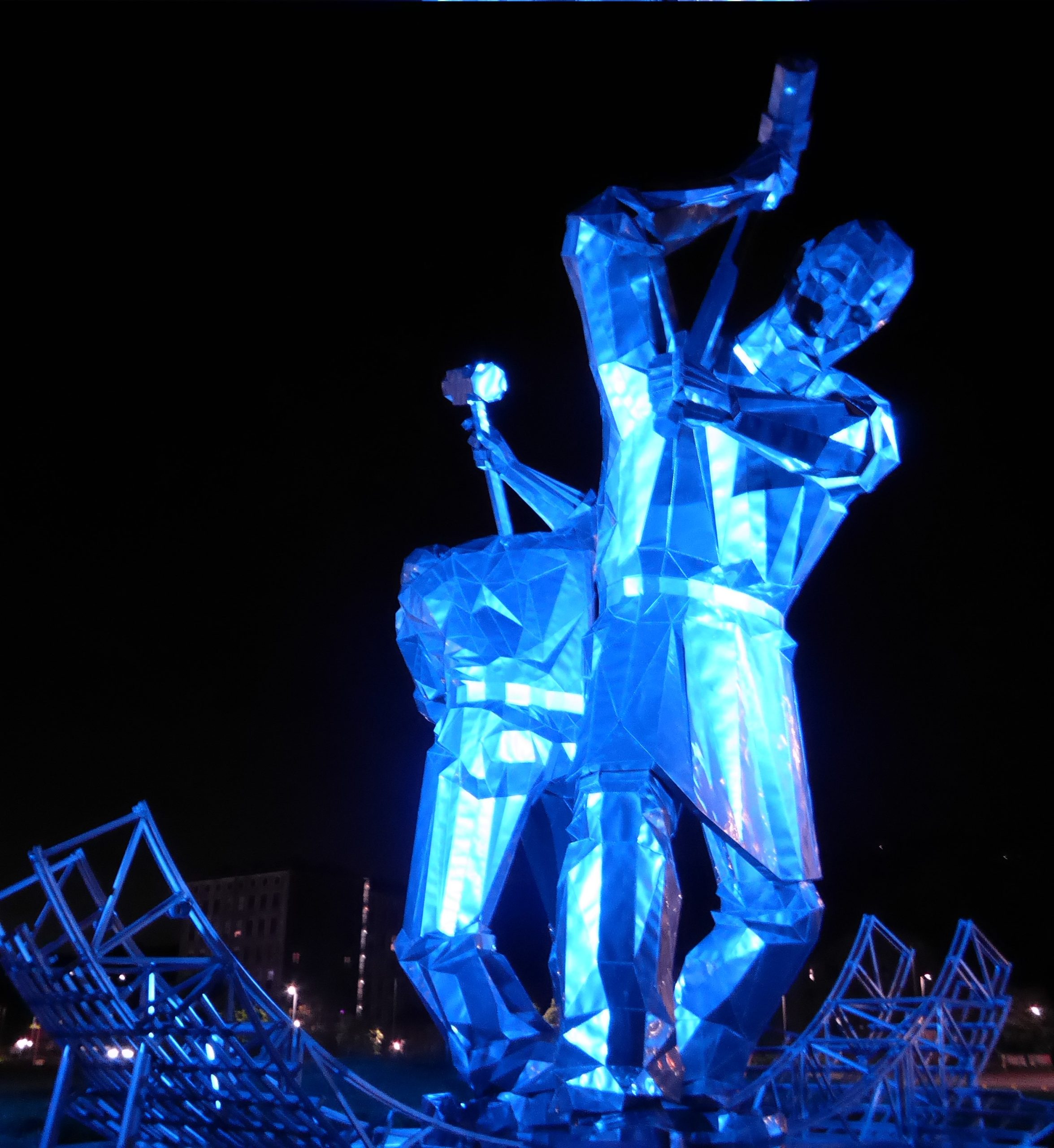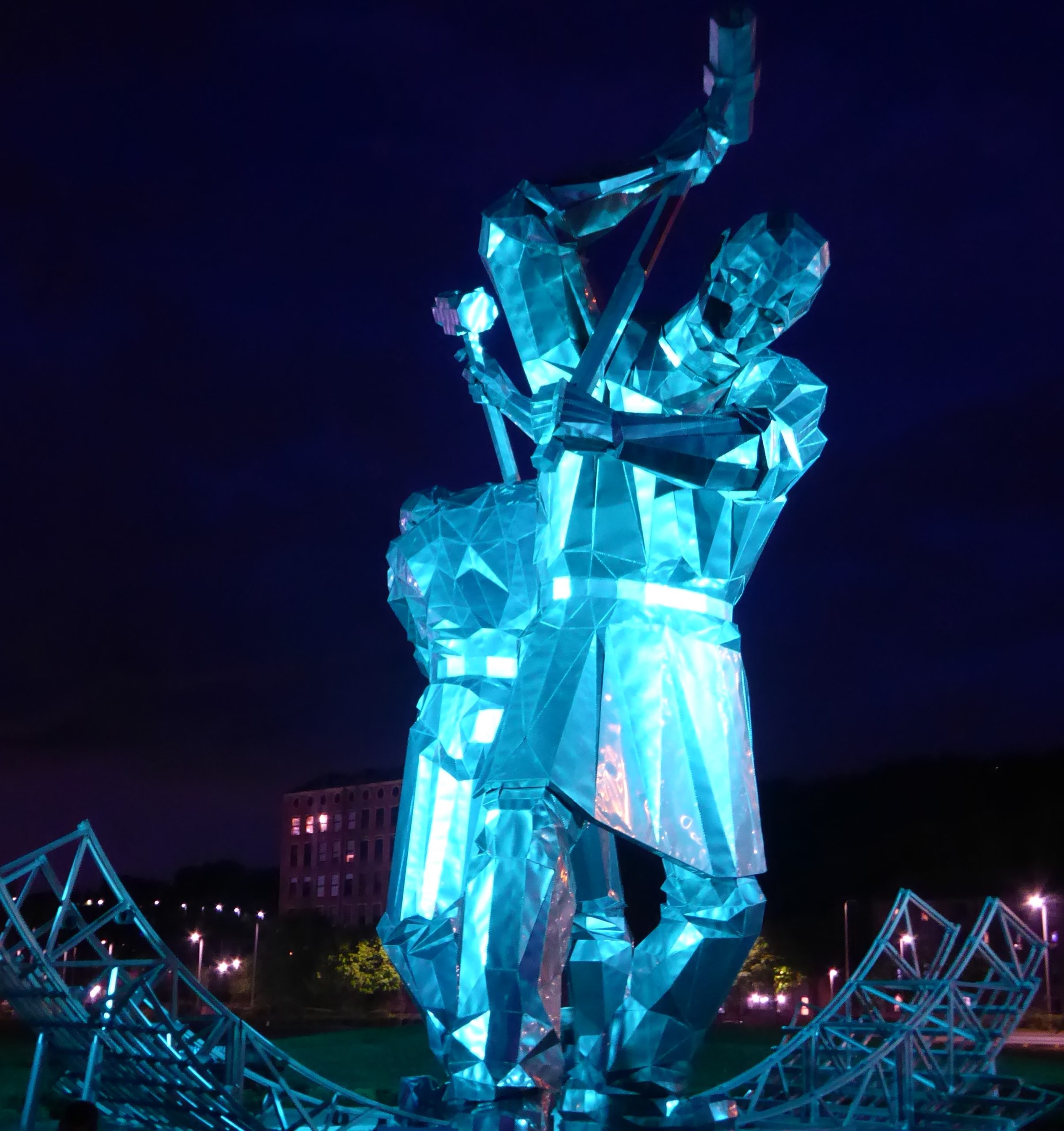 The 10 metre (33 feet) tall stainless-steel figures of ‘Shipbuilders of Port Glasgow’ at Coronation Park by John McKenna were bathed in blue to mark not only International ME Awareness Day 2024 but also International Nurses Day. Erected in 2023 and known locally as ‘The Skelpies’ the statues commemorate the shipbuilders of Port Glasgow and the Lower Clyde.