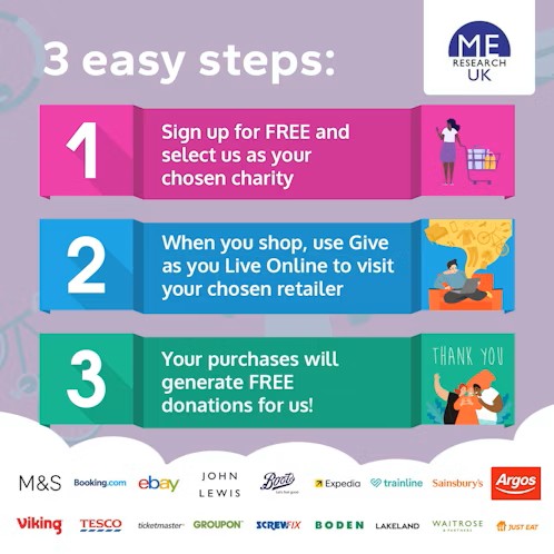 Did you know, when you sign up to Give as you Live, the retailers with whom you shop will make a donation to us for every purchase you make? It’s completely free, and the funds help us to inform, invest and influence. Sign up to support ME Research UK today.