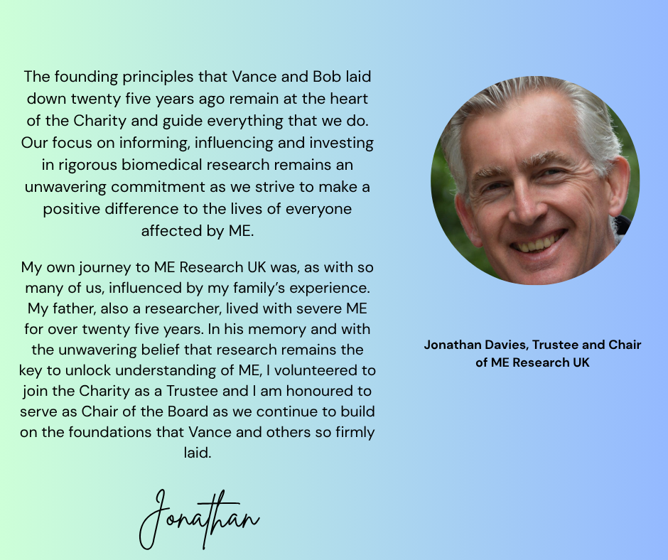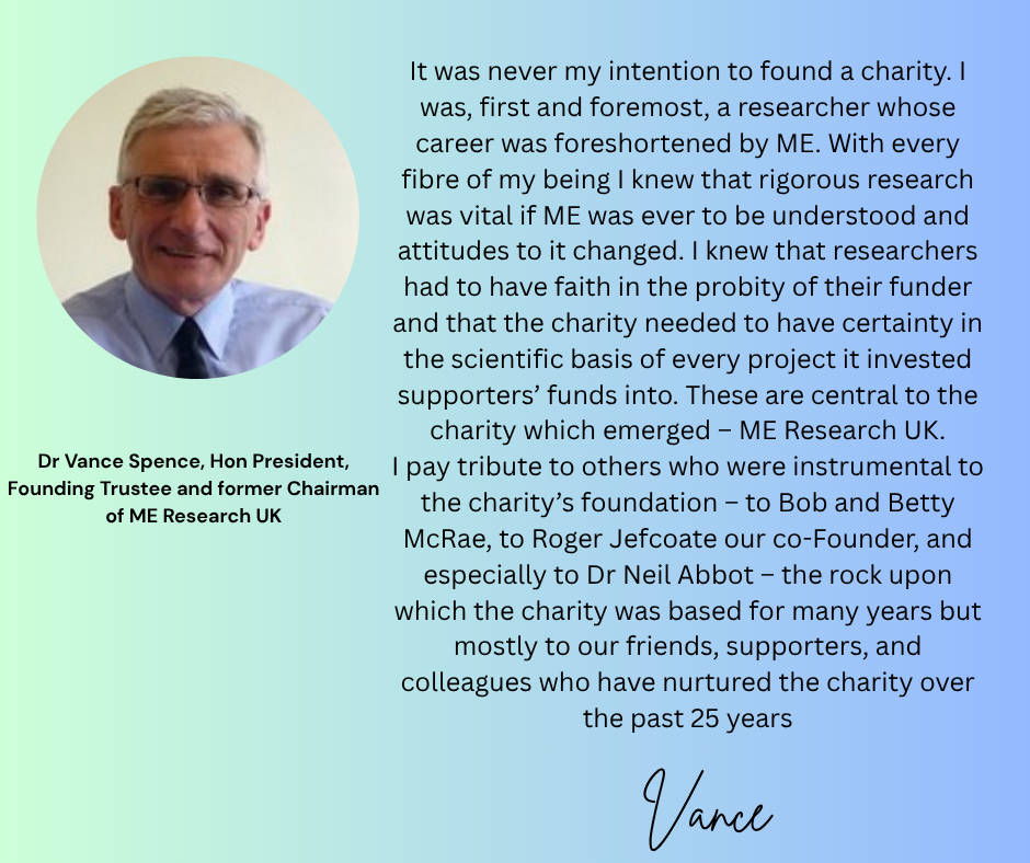 As ME Research UK marks 25 years since its foundation, Dr Vance Spence Hon. President, Founding Trustee and former Chairman of ME Research UK gives an insight into why he founded the charity and Jonathan Davies, current Chair, looks to our current work.