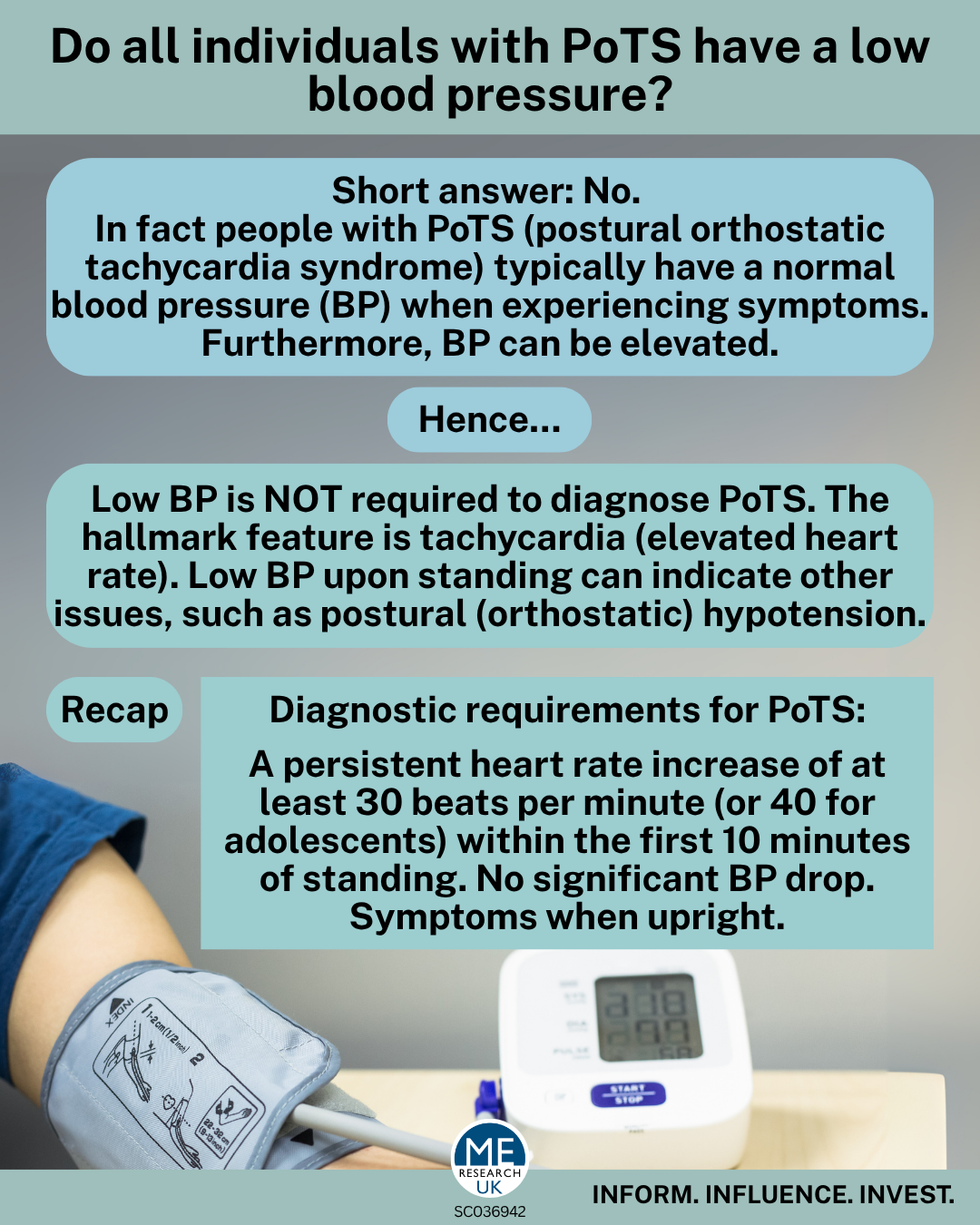 This means that you can absolutely have PoTS even if your blood pressure stays normal – or even increases – when in an upright position. In fact, if your blood pressure drops by a large amount, this might suggest another issue, such as orthostatic hypotension (otherwise known as postural hypotension).
