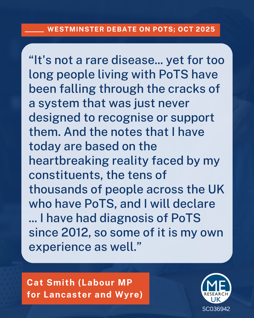 Labour MP for Lancaster and Wyre, Cat Smith, led the Westminster debate on postural orthostatic tachycardia syndrome (PoTS) emphasising that PoTS is not a rare disease, yet individuals with PoTS are “falling through the cracks” of a healthcare system unprepared to recognise or support them. Drawing on her own experience and those of constituents across the UK, she called for urgent reform in diagnosis, treatment, and care pathways for people with PoTS. Minister Ashley Dalton responded during the session that lasted around half an hour.