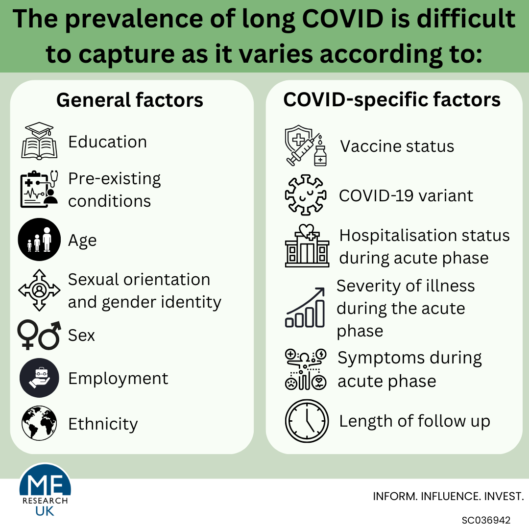 Research suggests that the prevalence of LC is impacted by a number of different factors; these include COVID-related factors and more general characteristics. These factors are especially important to consider when comparing or combining results from different studies. Where studies have used different sample populations, prevalence could vary widely based on not only the age, sex, and ethnic make-up of the population, but also the proportion of people who had the Omicrom COVID variant, the number who were unvaccinated, and how many were hospitalised. Often, some of this information (especially that relating to COVID variant and reinfection status) has not been collected making it extremely hard for researchers to take these factors into account in the analysis.
