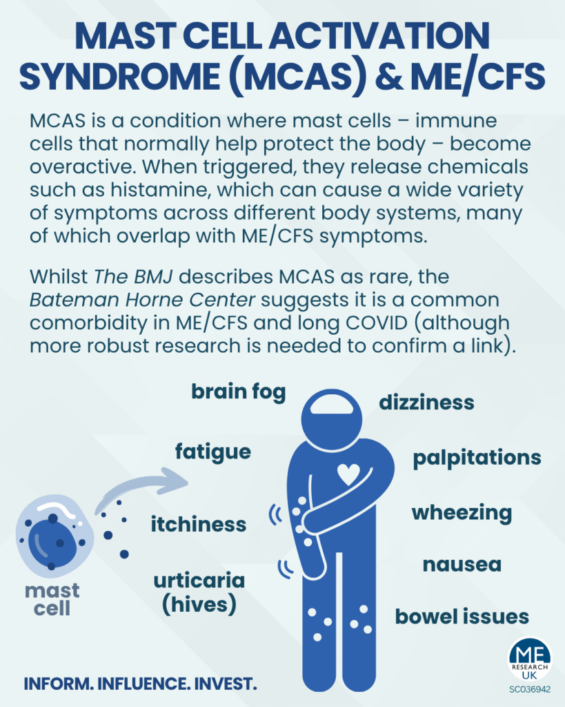 Mast cell activation syndrome (MCAS) is a condition where mast cells – immune cells that normally help protect the body – become overactive. When triggered, they release chemicals such as histamine, which can cause a wide variety of symptoms across different body systems, many of which overlap with ME/CFS symptoms. It is thought that activation of mast cells can contribute towards symptoms of dysautonomia (dysfunction of the autonomic nervous system).